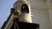 man with a camera on top of the a building