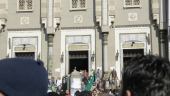 People gathering in front of a mosque, there is a sound of prayer, quran, egyptian flags